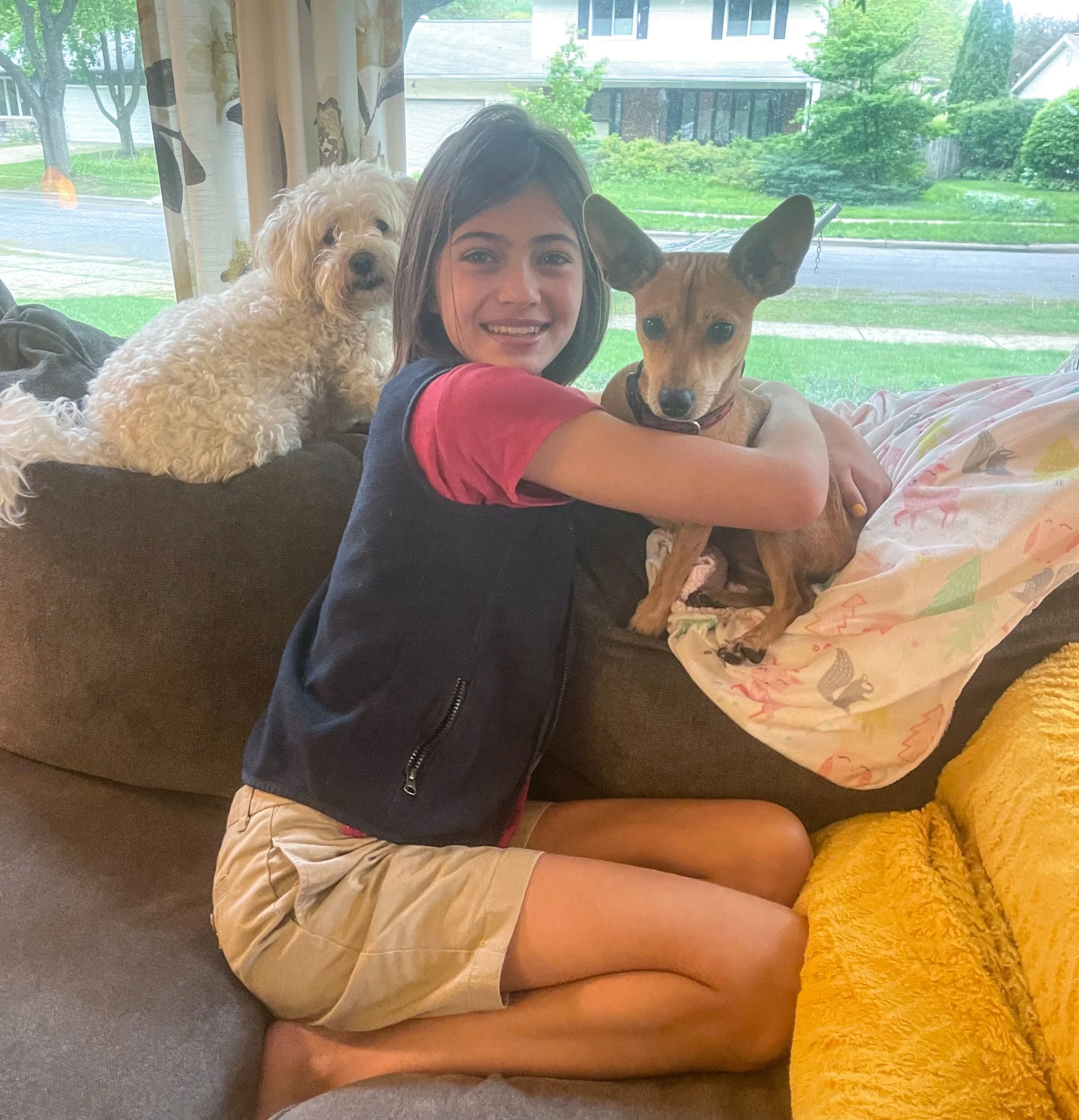 “We got Alpha from Fetch. It took a little longer than a breeder because you can't just go there and get a dog. So first we had to apply. They also did a home visit, but we did it on zoom. We gave a tour of our house and yard and showed all of us and Snowball. We got to see the dogs on the website. They have pictures and stories that tell you about the dogs and if they are good with other dogs or kids. There were a lot of dogs we liked!! We just email if we wanted to meet a dog, and we liked Alpha so she was the first one we met. They REALLY wanted to make sure it was the right dog. After Snowball met Alpha we decided to adopt her. She is so cute, sweet, cuddly and smart. She listens better than Snowball! I got to name her. I picked Alpha; no one liked it at first but it fits her because she can get attention-jealous and is protective!” - Zara